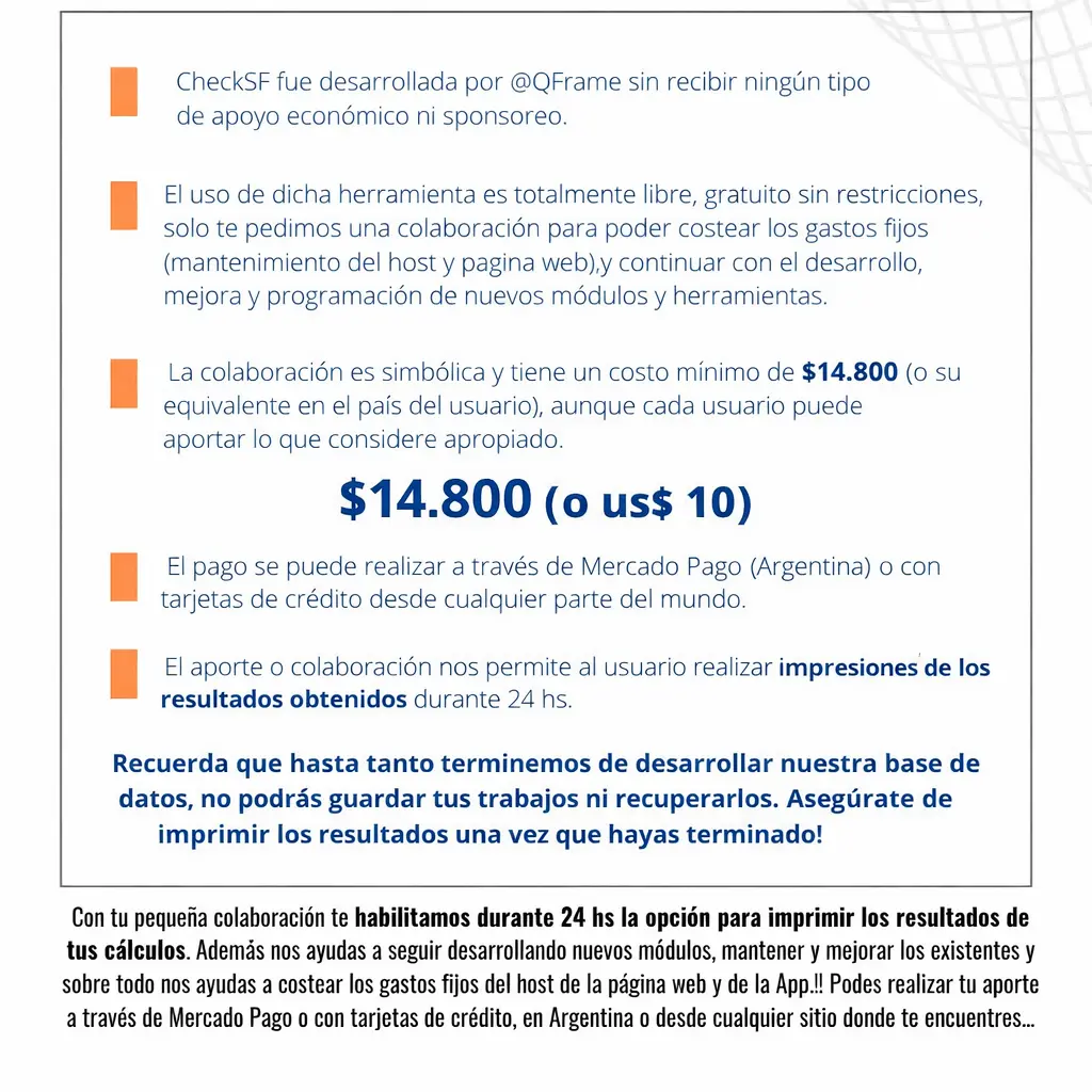 Qcheck SF nos ofrece resultados primarios y preliminares, que serán luego ratificados y/o rectificados con la documentación técnica pertinente, permitiendo al usuario tener de manera antelada, algunas precisiones y/o resultados que nos permitan avanzar con el proceso de documentación a nivel de anteproyecto y estudio.